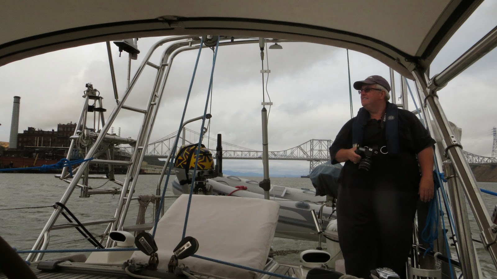Away from the dock by 11:00, we set the sails with two reefs and head south. The wind is about 12-15 knots with occasional gusts. Mostly broad reaching the sail is more comfortable today. We sail past Hunters point, see planes landing and departing SF International airport. There are around six ships anchored out in the middle of the bay. One is off loading to a barge a loose dirt like material. We turn back toward Alameda. We were able to have a very nice relaxing 11 mile sail before once again turning on the motor. The plan is to stay at a marina in the Oakland inner harbor. There are four large cargo ships moored in the harbor in various stages of loading and unloading. When we get to where the marina should be, we do not see any marina that would warrant the 70 dollar a night fee. They all look run down, not safe. So Brad calls Emery Cove were we stayed the first night and made reservations to stay over the weekend.